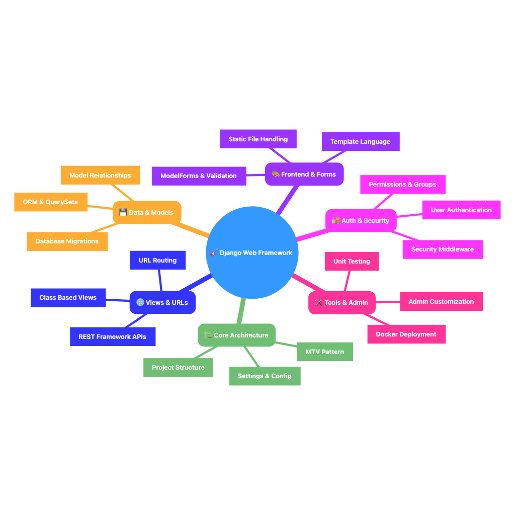 Django ist ein hochentwickeltes Python Web-Framework, das schnelle Entwicklung und sauberes, pragmatisches Design fördert. Mit seinem "Batteries included"-Ansatz bietet Django alles, was für die Entwicklung moderner Web-Applikationen benötigt wird: ORM, Admin-Interface, Authentifizierung, Template-Engine und vieles mehr. Das Framework folgt dem DRY-Prinzip (Don't Repeat Yourself) und ermöglicht es, sichere und wartbare Web-Applikationen effizient zu entwickeln.